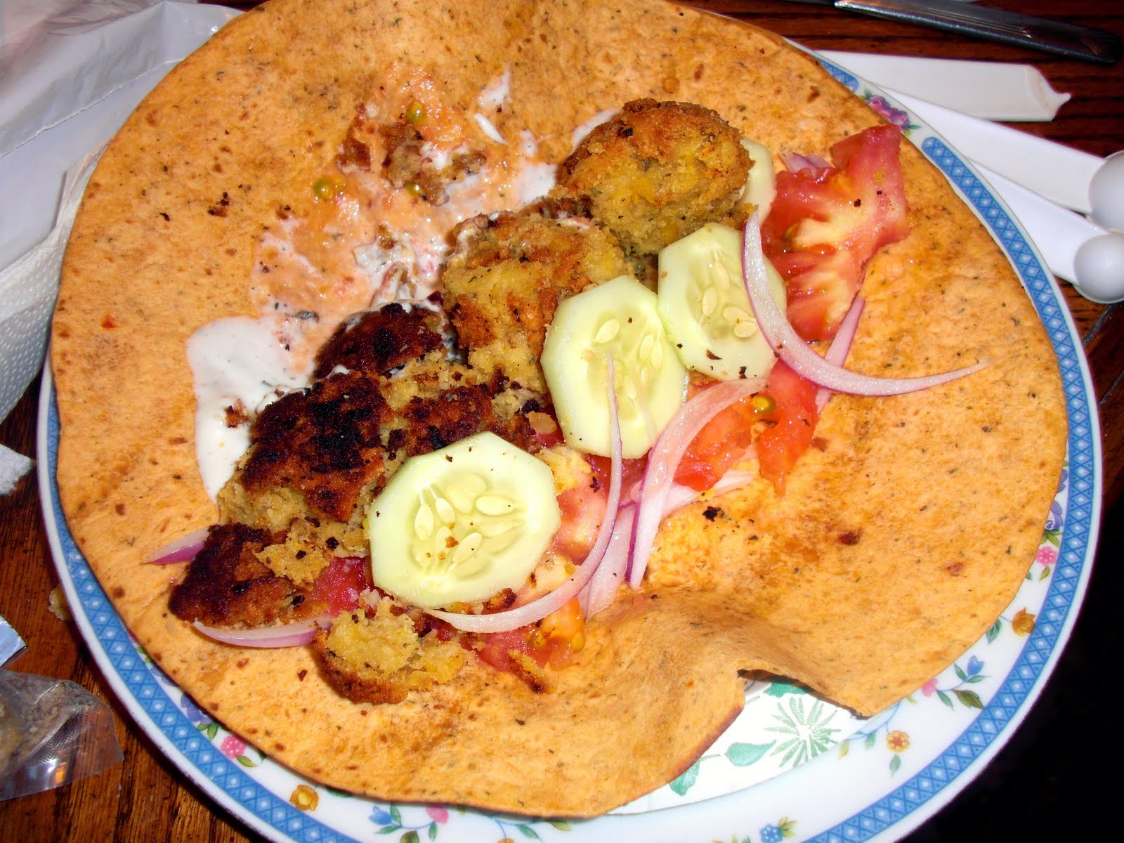 | Falafel, cucumber, onion, tomato and ranch dressing on a tomato basil tortilla. |